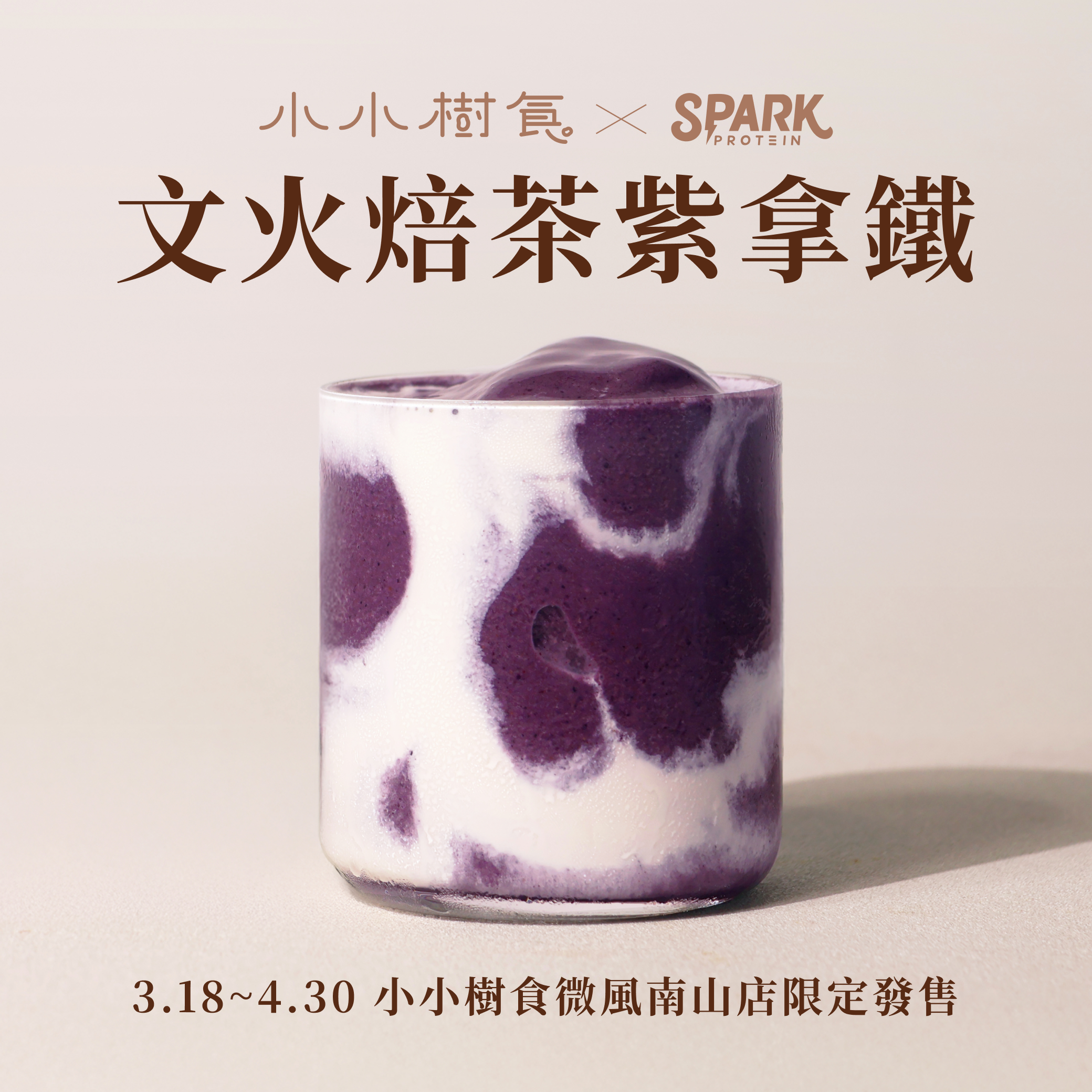誰說健身補給不能很優雅?在信義區的微風南山,小小樹食與 Spark Protein 聯手打造了一款讓少女心大噴發的「文火焙茶紫拿鐵」。