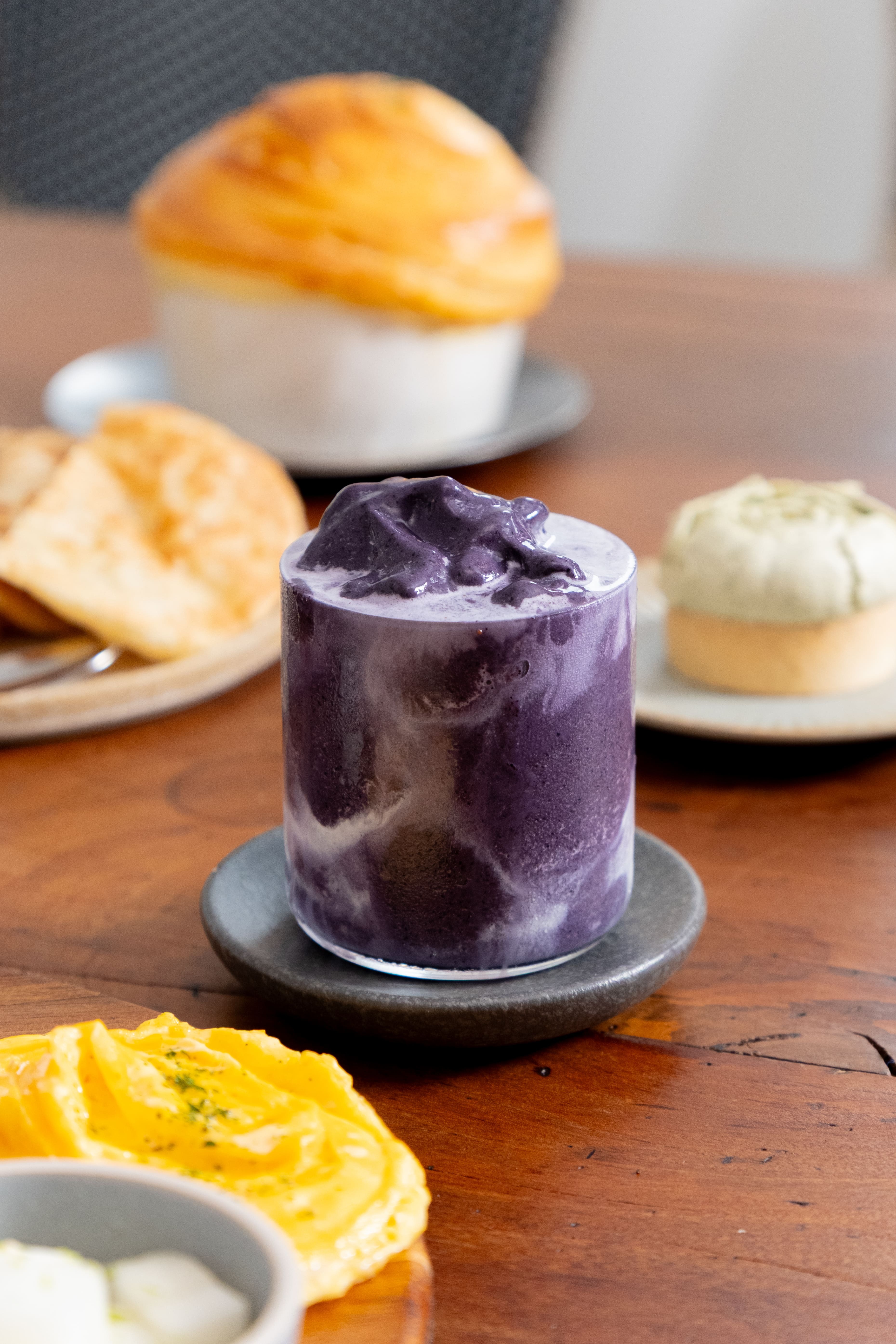 這杯飲品一上桌,那抹夢幻的薰衣草紫便瞬間收服了快門。這抹神祕色澤來自天然藍莓,襯托出這杯飲品想傳遞的「健康美學」——不只要內容實在,顏值更要隨時在線。